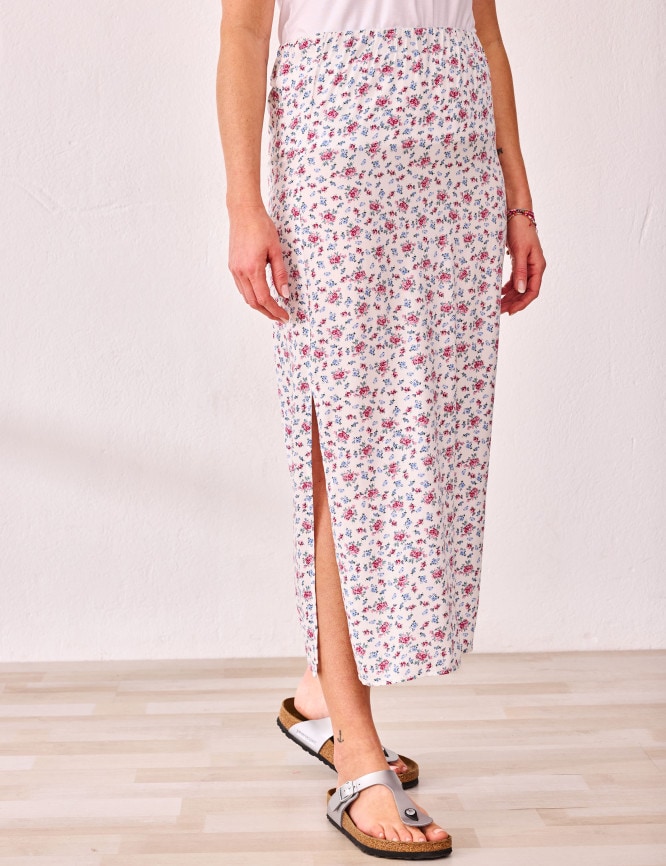 - Sommerlicher, gerade geschnittener Rock mit seitlichem Gehschlitz (rechts)