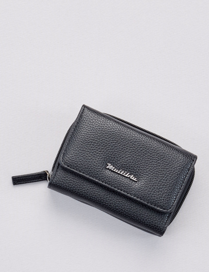 • Face avant : compartiment dépliant pour billets et cartes pouvant être fermé par un bouton poussoir et un rabat