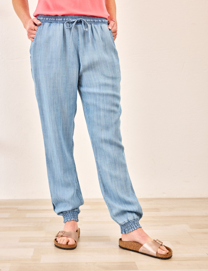 • Bund mit Gummizug, seitliche Eingrifftaschen