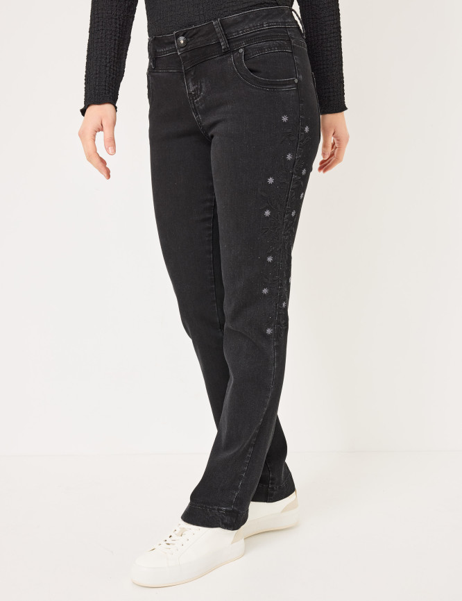 • Die dekorative, seitliche Blümchen- und Rankenstickerei mit Glitzersteinchen macht die Jeans zum ultimativen Eyecatcher